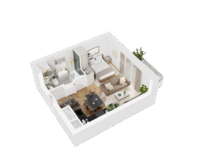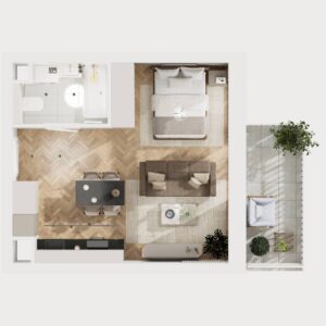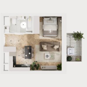W jednym kameralnym budynku zaplanowano 96 mieszkań o powierzchniach od 32 do 97 m² – idealnych zarówno dla singli, jak i rodzin. Nowoczesna architektura, duże przeszklenia i funkcjonalne układy wnętrz tworzą przestrzeń, w której światło i komfort grają główne role.